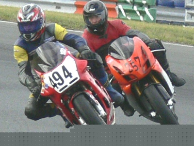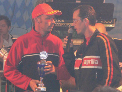 Tatsächlich, der Deckel hielt den Filter trocken. Leider lief die Karre nun viel zu fett und sprotzelte am Ende jeder längeren Vollgas-Geraden nur noch kläglich. Zu allem Übel trocknete die Strecke auf und die Regenreifen verrauchten jämmerlich. Aber es reichte diesmal sogar zum dritten Gesamtrang vor einer Horde Aprilia Mille, Duc 999, 998 und 916. Bronze bei den dicken Vierventilern! Das war logischerweise auch der Sieg in der Division 2.